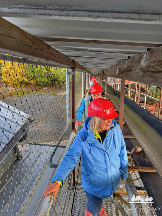 Ausgestattet mit Schutzhelmen erkundeten rund zehn Teilnehmerinnen und Teilnehmer das historische Industriedenkmal – über Gitterroste und Stahltreppen, von Stockwerk zu Stockwerk, mit eindrucksvollen Ausblicken über den gesamten Stöffel-Park.