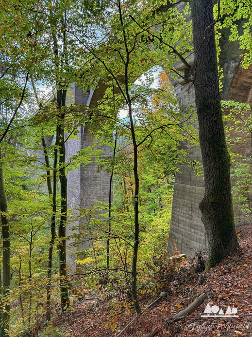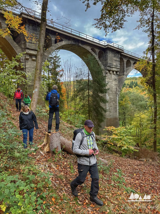 Auf schmalen Naturpfaden führte die Route anschließend bergab ins Nistertal, wo die Gruppe ein weiteres Highlight erwartete: die historische Eisenbahnbrücke, die seit über 100 Jahren das Tal überspannt – ein Bauwerk aus Stampfbeton, errichtet ganz ohne Stahlarmierung, das noch heute Ingenieure staunen lässt.
