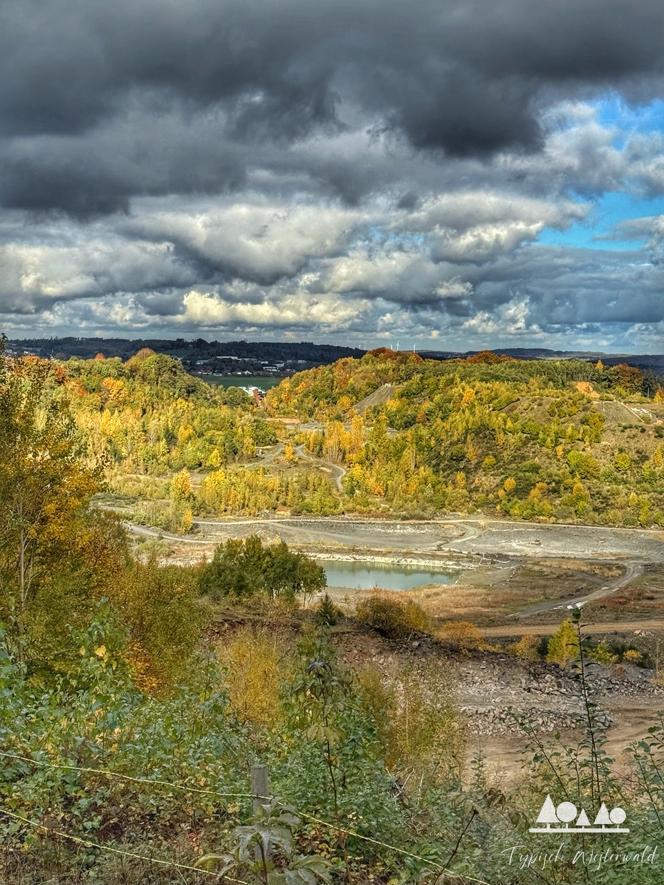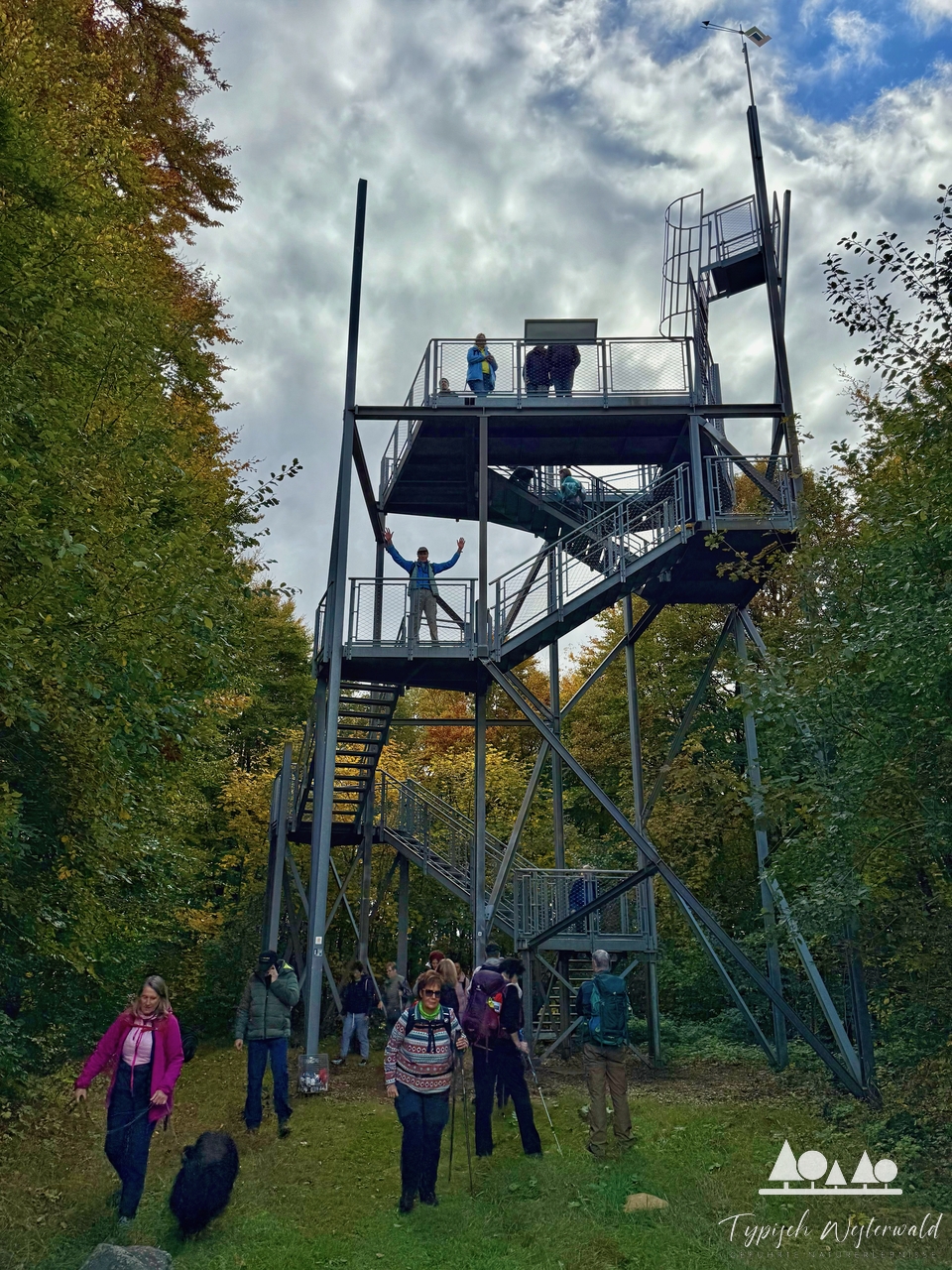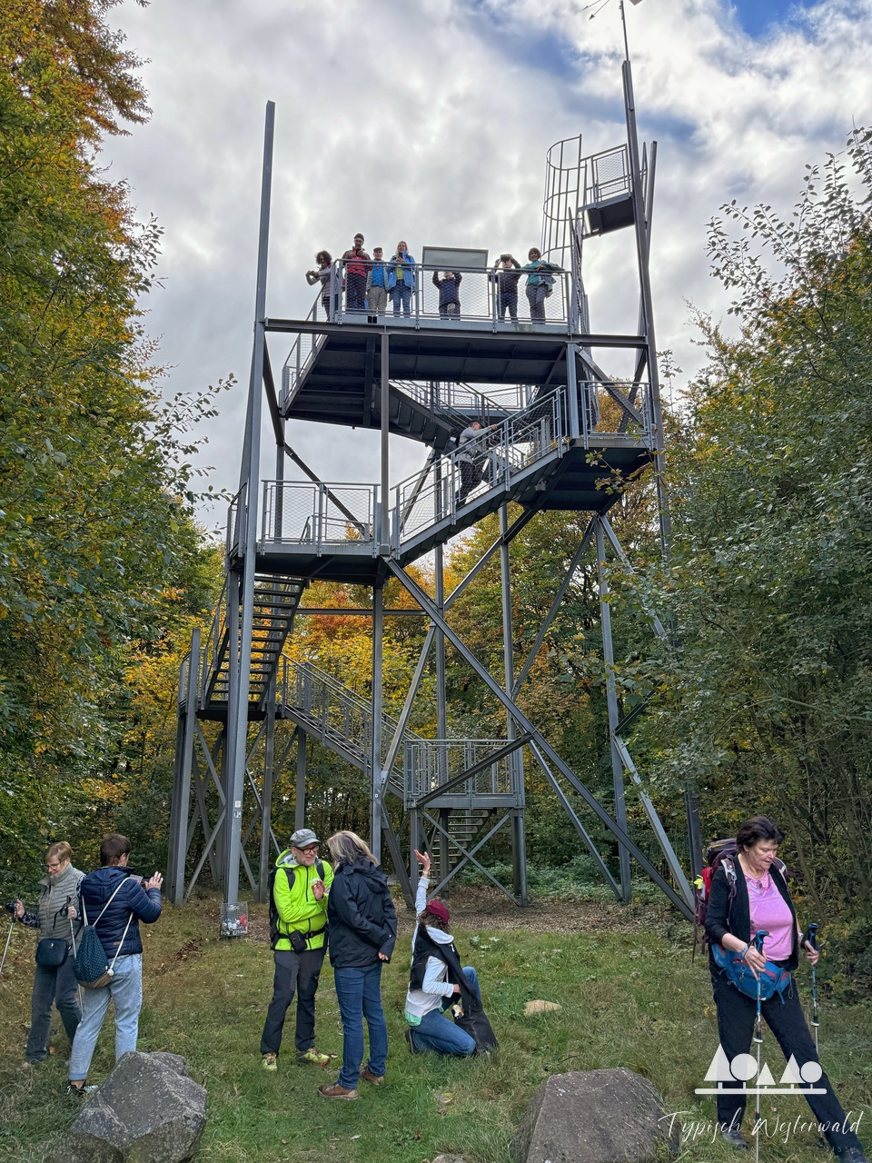 Nach dem ersten längeren Anstieg wartete der Stöffel-Aussichtsturm mit einem weiten Blick über das frühere, größte zusammenhängende Basaltabbaugebiet des Westerwaldes – ein Panorama, das die industrielle Vergangenheit des Ortes eindrucksvoll sichtbar macht.