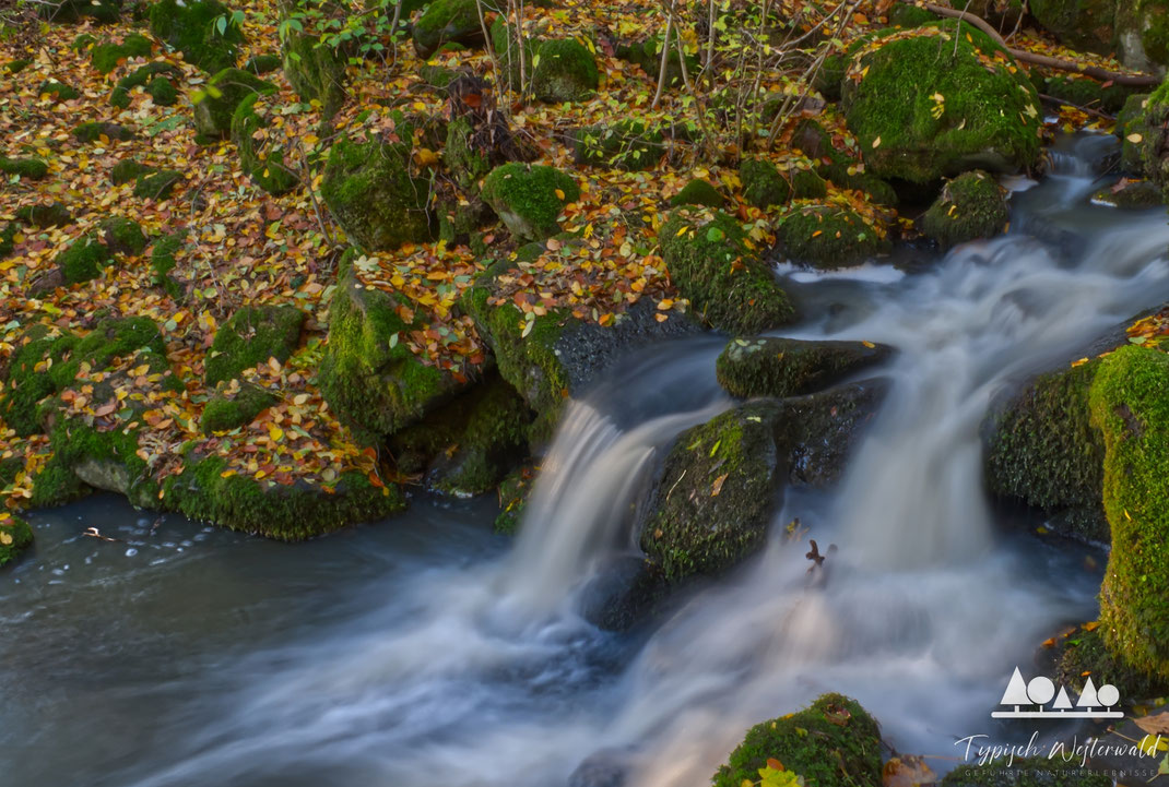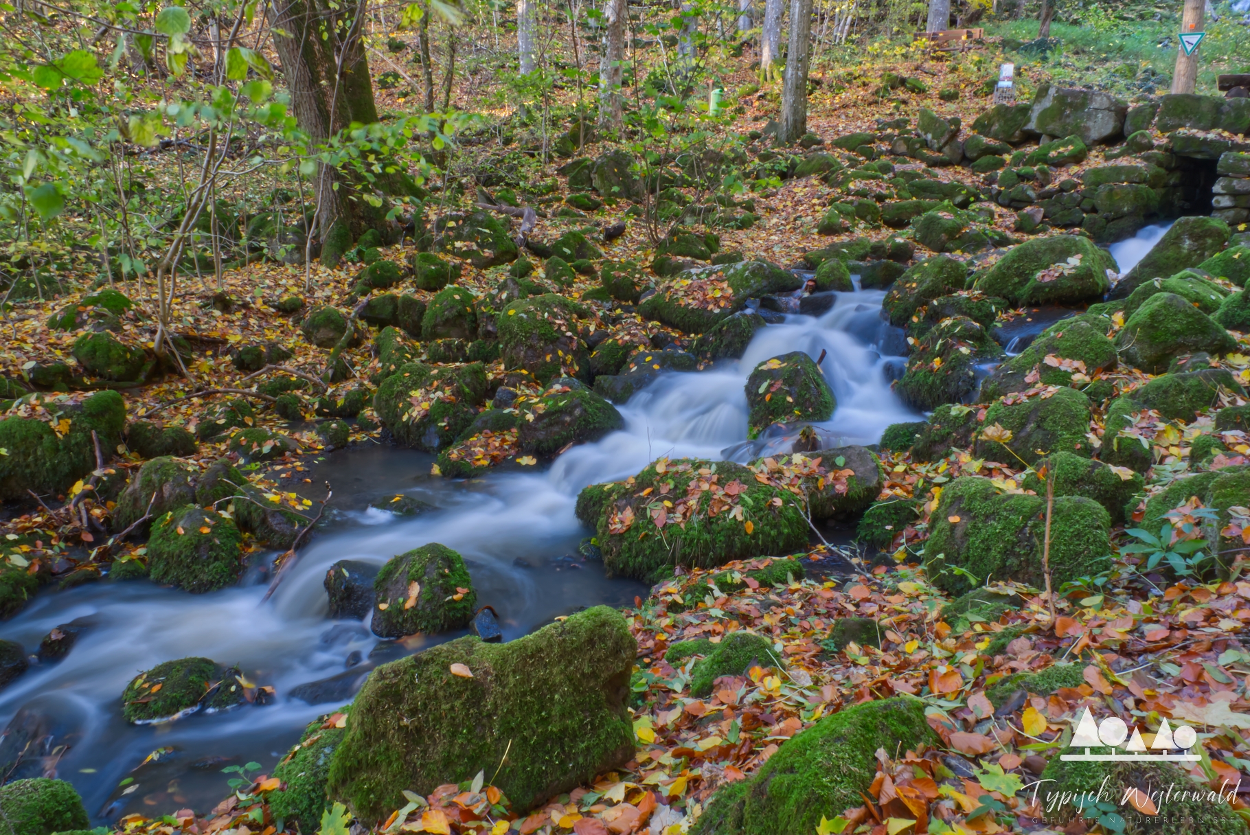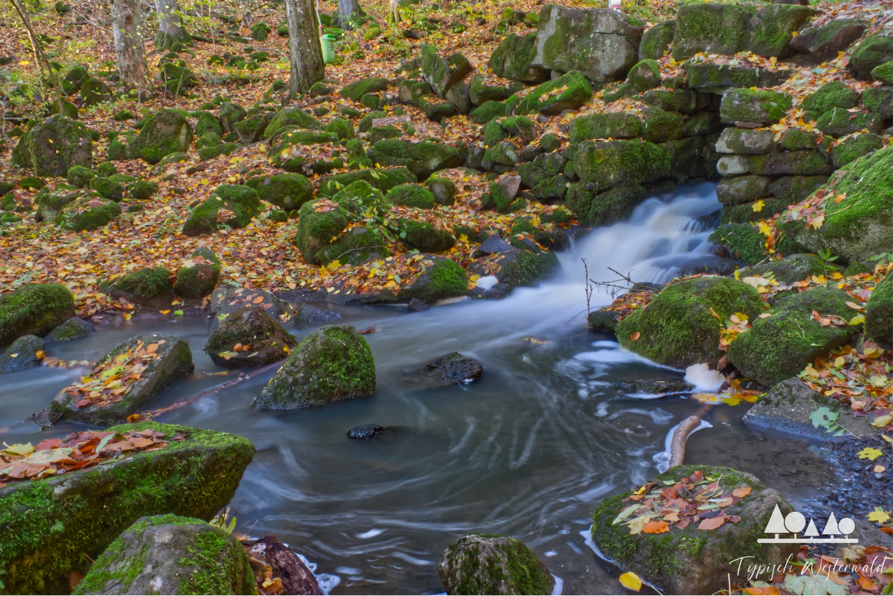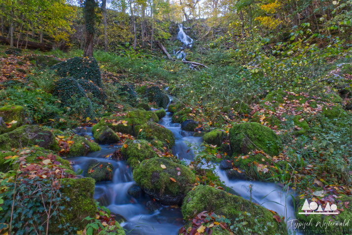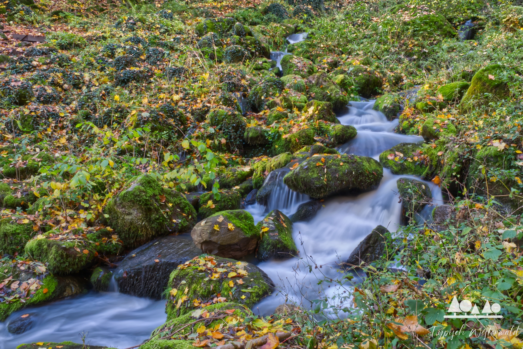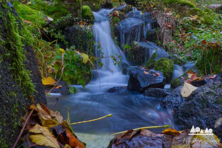 Besonders reizvoll ist das Zusammenspiel aus Wasser, Felsen und Vegetation. Moos überzieht die kantigen Basaltsteine, zwischen Farnen und Wurzeln glitzert das Wasser, das in kleinen Stufen zu Tal rauscht.